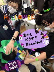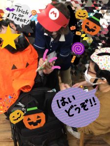 子どもたちにも合言葉のトリックオアトリートを唱えていただき